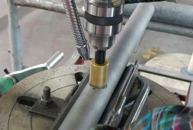 마킹 된 천공부에 Hole saw 중심이 파이프의 중심과 일치되도록 천공합니다.